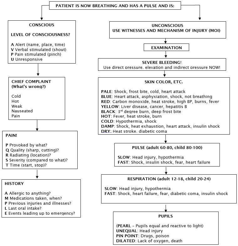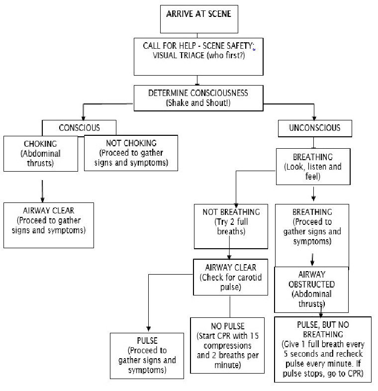 Immediate life threatening conditions including: breathing problems, cardiac arrest, heavy bleeding, impending shock, heat stroke, hypothermia, poisoning, diabetic emergencies, open chest and abdominal injuries.