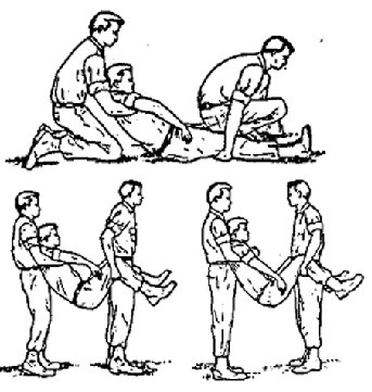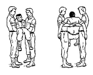 With victim lying on his back, a bearer kneels on each side of his hips. Each bearer passes his arms under the victim's thigh and back and grasps the other bearer's wrists; the bearer's stand up, lifting the victim.