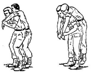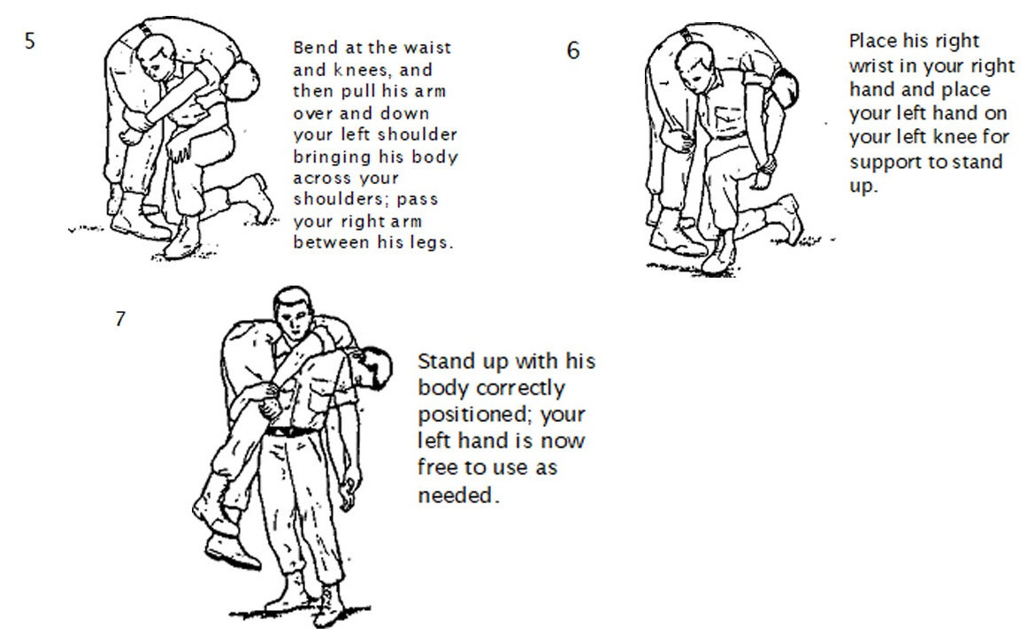 Lift the victim from the ground the same way as the Fireman's Carry by supporting him with your arms around him and grasping his wrist closest to you and place his arm over your head and across your shoulder. Move in front of him while supporting his weight against your back; grasp the other wrist and place his arm over your shoulder. Bend forward and hoist him as high on your back as possible so that all his weight is resting on your back.