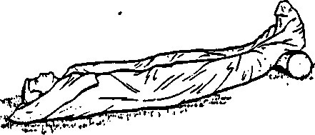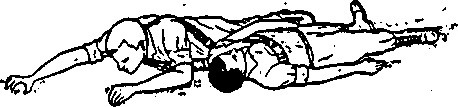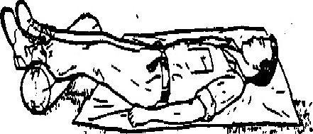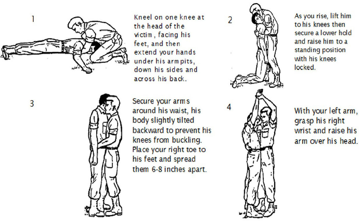 Extend two pistol belts, or similar objects, to their full lengths and join them together to make a continuous loop. Roll the victim on his back. Pass the loop over the victims head and position it across his chest and under his armpits; then cross the remaining portion of the loop forming a figure "8". Lie on your side with back away from victim, resting on your right elbow. Slip the loop over your right arm and shoulder and turn onto stomach, dragging the victim as you crawl.