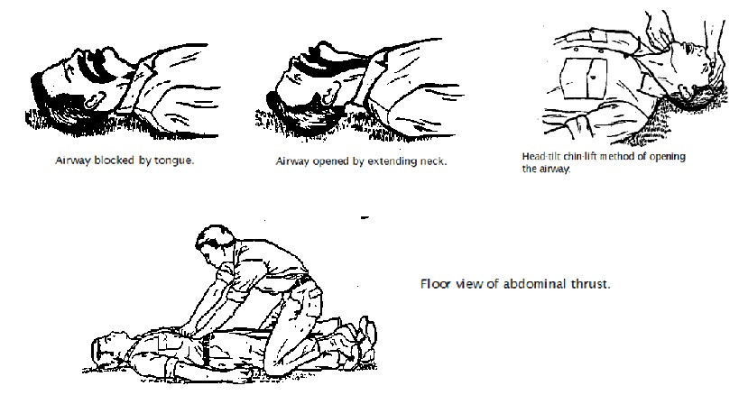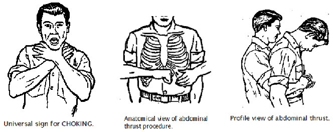 Abdominal thrusts (look, breath, sweep, 8 thrusts)