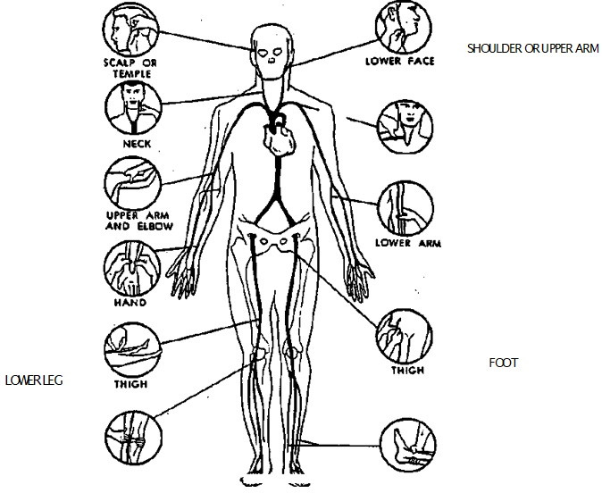 If blood is spurting from wound (artery), press at the point or site where main artery supplying the wounded area, lies near skin surface or over bone, as shown. This pressure shuts off or slows down the blood flow from the heart to the wound until a pressure dressing can be applied. You will know you have located the artery when you feel a pulse.