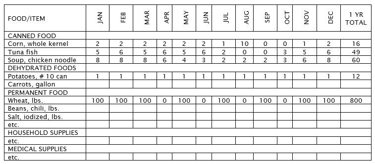 PLAN 1 - You should initially determine your storage requirements by sitting down with your family, and making a list of foods and household necessities you know you use. If this is done, each member of your family will be recognized, and having participated, will tend to increase his interest in the storage plan. (The list, thus developed, will be used as a work sheet and permanent reference hereafter, so keep it on heavy bond or ledger paper so as to preserve it). Write the list on the left side of the paper. Make 13 vertical columns to the right of the list, with each column headed by a month plus a TOTAL for the year. Next plot the quantities you know you will use of each item under each month. The worksheet will then look like this: