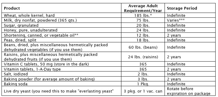 PLAN 2 - Of course, many individuals will want to store only sufficient quantities for an "existence" diet. Others may have different ideas as to what the basic foods are, but from research we have conducted, we recommend the following quantities for an existence diet. Also shown is the period of time the products will keep without spoiling. How to store these items is explained in Section II (The word "indefinite" means no limit.)