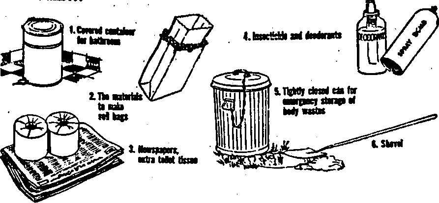 (e) Persons in city apartments, office buildings, or homes without yards, should keep a supply of waterproof containers on hand for emergency waste disposal. Where flush toilets cannot be used and open ground is not available for the construction of privies, such disposable containers offer a practical method of emergency waste collection and disposal. The used containers may be stored in tightly covered garbage cans or other waterproof utensils fitted with lids. Homemade soil bags for this purpose may be prepared very easily by putting one large grocery bag inside another with a layer of shredded newspaper or other absorbent material between. Apartment dwellers should have sufficient grocery bags on hand now for possible emergencies. A supply of old newspapers will come in handy for other sanitary uses, too, for wrapping garbage, lining containers, insulating bedding from floors, and lining clothes against the cold.