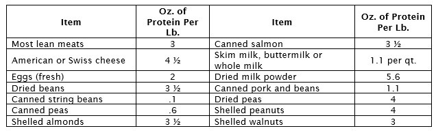 It is important that you maintain essential protein in your diet. At least 2 ounces of animal or 4 ounces of vegetable protein are recommended for each person daily. The following are the main sources of protein: