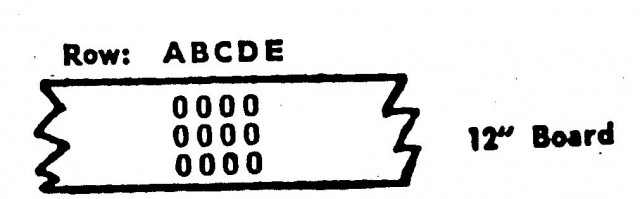 For example, you can put six #2 ½ size cans in a row on a 12" board, stacked two high and three deep. Thus, if you were storing 24 cans of tomatoes, you would have four rows with six cans in a row. Leave the fifth row empty. The storage shelf would then look like this: (showing top view of cans stacked 2 high):