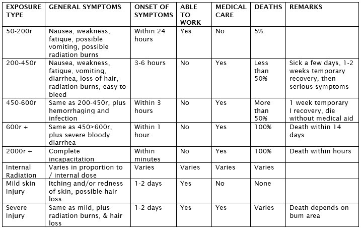 Effects (signs and symptoms of exposure): Radiation damages and changes body tissue and blood cells. The extent of the damage and the severity of the symptoms are directly related to the amount of radiation and how long the victim is exposed to it. General symptoms include nausea, weakness, fatigue and diarrhea. More sever cases will exhibit hair loss, burns, fever and hemorrhage. In general, the appearance of these symptoms within 3 hours of exposure indicates a fatal dose where-as the appearance of symptoms after 24 hours or more indicates a high probability of recovery. Be aware that any exposure to radiation increases the risk of cancer and other medical problems.