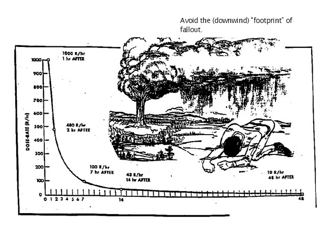 Special Precautions: Filter all exposed water and decontaminate (wash off) all food containers before opening to prevent ingestion of radiation emitting particles. In general, you should remain in shelter for at least 7 days and limit activity (e.g. gathering food and water, etc.) outside of the shelter to no more than one hour per day for an additional 7 days. Note: In general, radiation decreases by a factor often for every seven fold increase in time. For example, if the radiation is 1000 r/hr at 10:00 am, it will be about 100 R/hr at 5:00 p.m., 43 R/hr at midnight and 10 R/hr after two days.