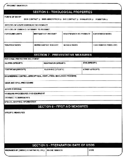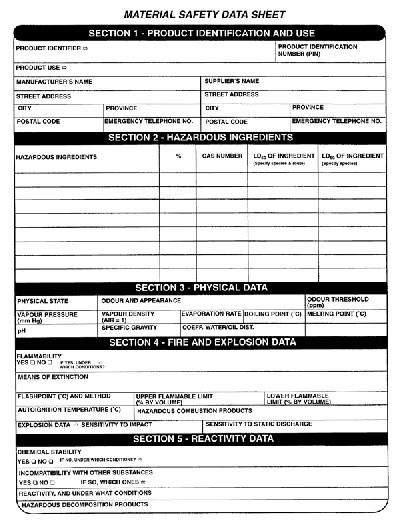 Material Safety Data Sheets serve as the primary means for transmitting information about toxic substances. A MSDS can vary in format from one to several pages in length, but they all must contain the following information: