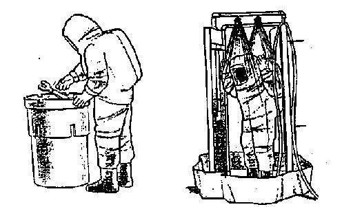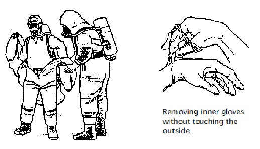 Decontamination Methods: Brush loose contamination off of protective clothing, and then wash down with lots of water, if available. If only small amounts of water are available, use wet cloth's to clean off protective clothing and dampen dust. Peel off protective clothing from the top down being very careful not to touch clothing or skin to the outside of the protective clothing. Peel off gloves last touching only the inside of the gloves. Wash any exposed skin and especially exposed hair.