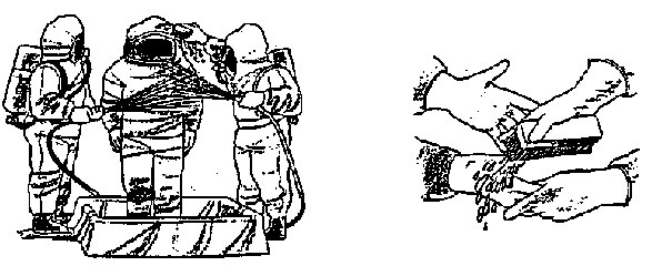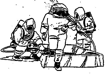 Protective Equipment: While heavy clothing will stop Alpha and Beta radiation, the only effective protection from Gamma radiation is to get out of the contaminated area FAST or taking shelter underground with as much soil, rock, brick, concrete, etc. between you and the outside as possible.The value of protective equipment is to keep radiation emitting particles out of your lungs and off of your body so that once you reach safety you can decontaminate. Dust masks and cloth can be used to protect mouth and nose. Rubber or plastic garments, such as rain wear or even plastic bags, can be used to protect the body. Plastic gloves and over-boots are essential. The head must be protected with a tight hood or rain cap (even a shower cap). The eyes should be protected with goggles, if available. Use tape and/or rubber bands to close sleeves and cuffs. Don protective equipment as soon as you are aware of potential hazards and keep it on until you reach a safe location were you can be decontaminated.