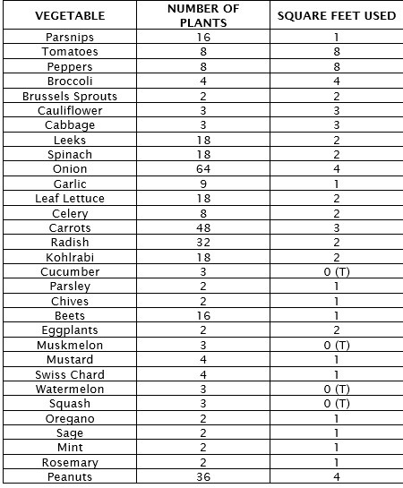 1 Plant Per Square Foot: broccoli, cabbage, corn, cauliflower, potatoes, pepper, tomato, eggplant and muskmelon.