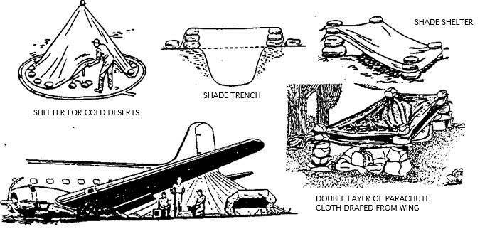 In the desert you will need shelter mostly from sun and heat. Use whatever natural shade you can find, such as a cave, rock ledge, or wall of a dry stream bed. A dry canyon in the desert is a dangerous camping ground; cloudbursts may cause sudden and violent floods which sweep along a dry valley in a wall of roaring water. Don't use the inside of the airplane for shelter in the daytime, it will be too hot. Get under the shade of a wing if you have no other shelter. If you stay with the airplane, you can make a good shade-shelter by tying a spread-out parachute as an awning to the wing. Leave the lower edge at least 2 feet clear of the ground for air circulation. Use sections of airplane tubing for tent poles and pegs. If the airplane is not available, make a shelter of your parachute. Two layers of cloth separated by several inches of air space are cooler than a single thickness. In winter months and especially at night, desert temperatures may drop to freezing and heavy rains may sometimes occur. Use the inside of the airplane for protection from cold and rain. Do your cooking outside to prevent carbon monoxide poisoning.