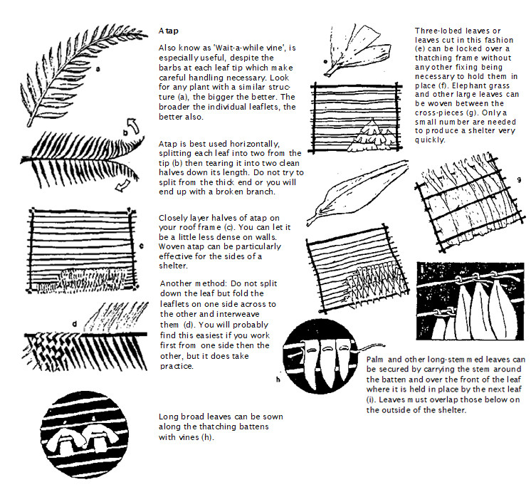 Lay the thatch shingle-fashion, with the tips of leaves pointing downward, starting from the bottom and working up, to shed the rain. Dig a small drainage ditch just inside the eaves of your shelter and leading downhill; it will help keep the floor dry.