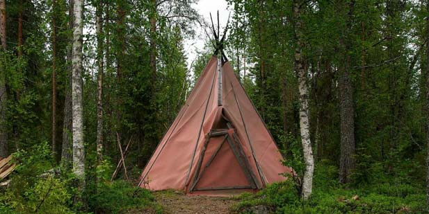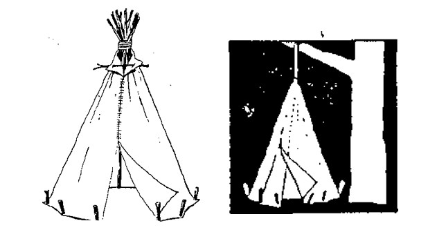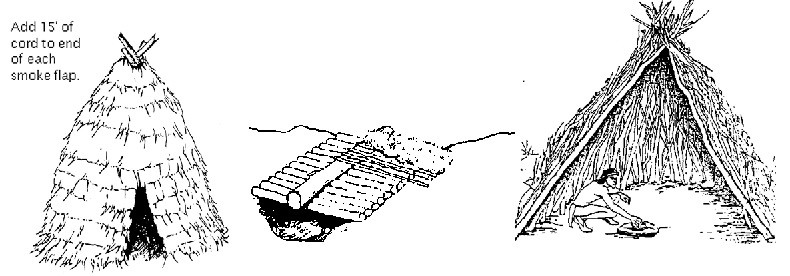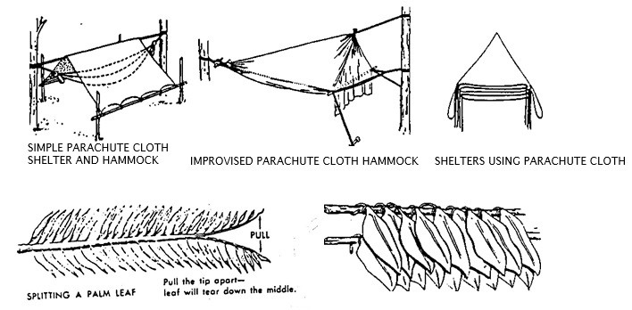 When stretched tightly, parachute material is water-repellent and durable, and it can be made into an excellent shelter. Like a tarp, it can be arranged in a variety of configurations, such as the lean-to above or the tepee at right. Since parachutes often have colors easily seen from the air, the shelter may aid in rescue as well.