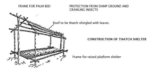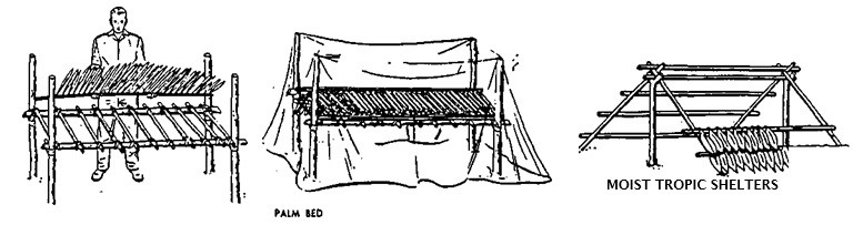 In rain forests and tropical jungle, the ground is damp and likely to be crawling with insect life; leeches and other undesirables. Instead of bedding down on the ground you will be better in a raised bed. Consequently you may want to make higher shelters, unless you are at an altitude high enough to make the nights cold, you will be less concerned with protection from the wind than with keeping reasonably dry. A thatching of palm, banana and other large leaves makes the best roofs and walls.