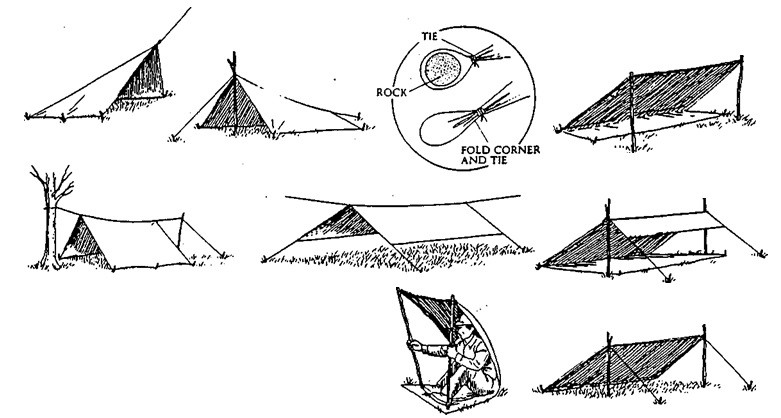 1. Shelter material you have with you (tent, vehicle, canoe, airplane, tarp, emergency blanket, sheet of plastic, parachute).
