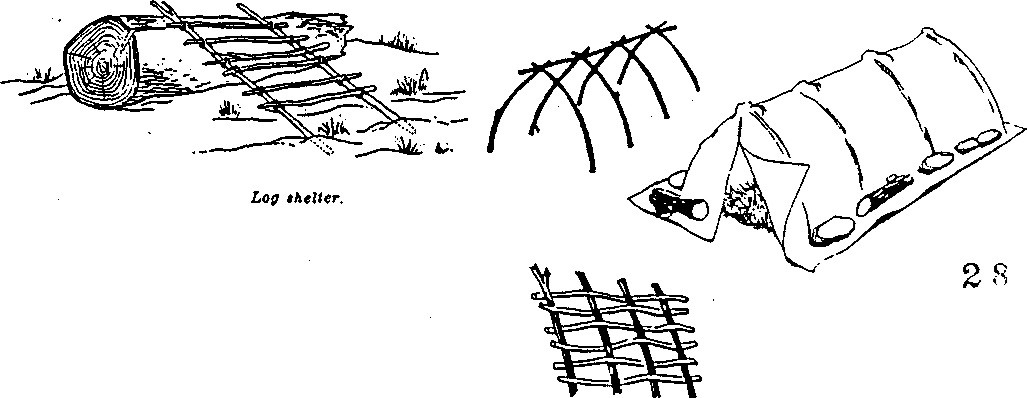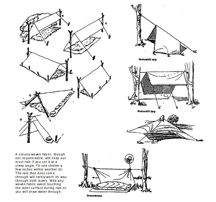 With a waterproof poncho, groundsheet or a piece of plastic sheeting or canvas, you can quickly and easily make a number of different shelters which will suffice until you can build something more efficient. Make use of natural shelter (a) or make a triangular shelter with the apex pointing into the wind (b). Stake or weigh down edges. If it is long enough, curl the sheeting below you — running downhill so that it keeps out surface water (c). Use dry grass or bracken as bedding. Do not lie on cold or damp ground.