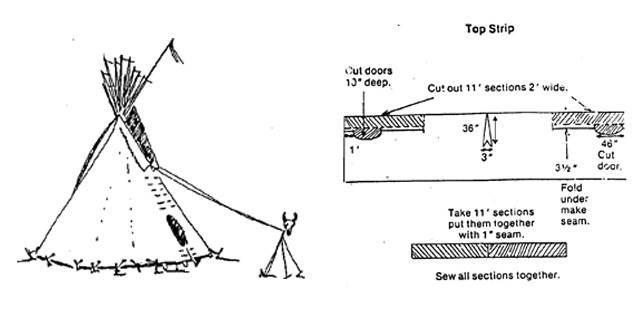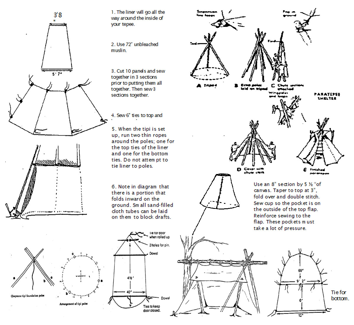 Parachute material can be used to cover a tepee, but even simpler is to suspend one from a tree. Give the sides a steep angle and even when the fabric is not impervious, water will run off. Fold a segment of the parachute; double for a door flap, slit along a seam and make a tie fastening to close it.