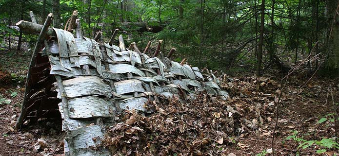Place sloping poles close together along a ridgepole to make a bough lean-to. Starting at the bottom, lay boughs with butts upward, overlapping them like shingles.