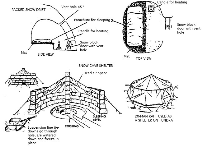 Dig into a drift of firm snow to make a comfortable shelter. Make use of the fact that hot air rises and heavier, cold air sinks. Create three levels inside: build a fire on the highest, sleep on the centre one and keep off the lower level which will trap the cold. Drive a hole through the roof to let out smoke and make another hole to ensure that you have adequate ventilation. Use a block of snow as a door and keep it loose fitting and on the INSIDE so that it will not freeze up and jam. If it does, a block on the inside will be much easier to free. Smooth the inside surfaces to discourage melt drips and make a channel around the internal perimeter to keep them away from you and your equipment.