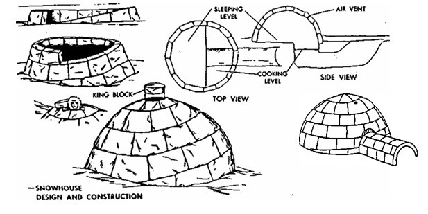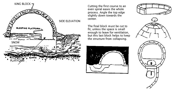 A house built of snow blocks is a useful semi-permanent refuge for two or more survivors. The construction of a snow house, however, requires considerable experience and practice. The emplacement of the blocks in this type structure is critical since the blocks are supported by three impinging corners, the two bottom corners and the top. The support of three corners, aided by the downward slope of the inclined plane, is the only "mystery" in snow house construction. Crevices between blocks are stuffed with triangular pieces of snow and finished off with soft snow gently rubbed in with a mittened hand. The snow functions as a hinder and becomes stronger than the original snow blocks. A drawback in constructing this type shelter is the need for tools; knife, saw, or axe. It has been proven by Eskimos that with a knife you survive, without it you need a miracle.