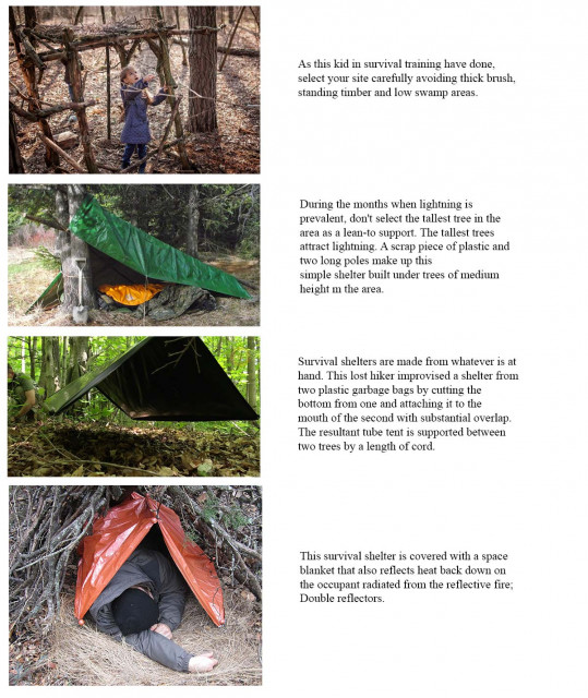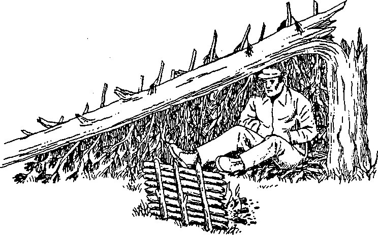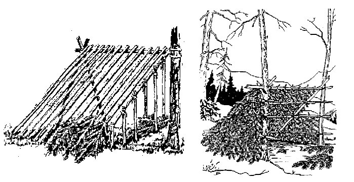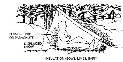 If no other shelter is available, a fallen tree can be made into a fair lean-to by cutting away branches on top and directly underneath. Use those branches and foliage to insulate and cushion the floor, improve the roof, and provide windbreak. A reflective fire at the opening can make such a shelter relatively comfortable. Enter your text here ...