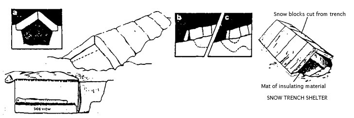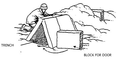 The snow trench as a shelter is a good option in open regions such as ice packs or where there is hard-packed snow. To build the snow trench, stomp or cut out a trench. Then, using a large knife or saw, cut slabs of ice or packed snow and arrange as shown. Loose snow may be packed over the slabs to provide further insulation.
