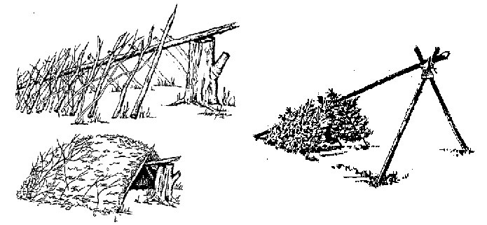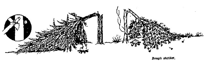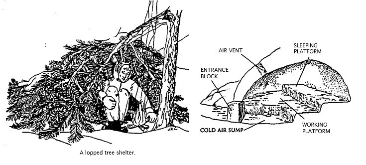 Snow or rock caves will be easily recognizable—but not so obvious are the spaces left beneath the spreading boughs of conifers in the northern forests when the snow has already built up around them. A medium-sized tree may have a space right around the trunk (a) or a large one have pockets in the snow beneath a branch (b). Try digging under any tree with spreading branches on the lee side.