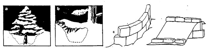 Even soft snow can be built into a windbreak. Those with equipment can cut blocks (c). This is the minimum shelter for the minimum effort.