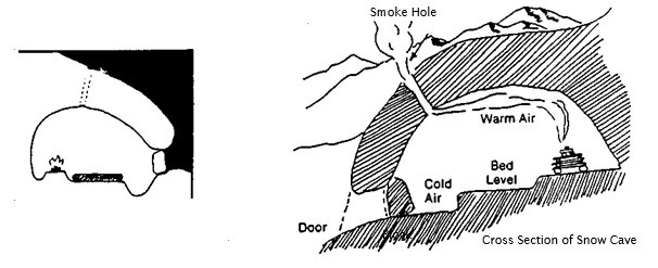 The snow cave can be made out of a snow drift hollowed out for a couple of Individuals. It takes considerable work to do this, but survival may make it necessary. Start low on the drift, dig in, and then up. Follow the diagram. Caution: Snow caves are not to be considered as permanent shelters, but for temporary, one-night occupancy, to protect one from the elements. In a long-term situation, snow caves deteriorate from the warm air inside and can collapse. If possible, choose a north slope, out of the sun or build in shaded areas to prevent major shrinkage.