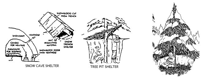 3. Natural materials available for shelter construction like rocks, trees, poles and snow.