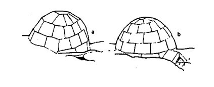 SNOW HOUSE (IGLOO) An igloo takes time to construct, but centuries of use by the Eskimo demonstrate its efficiency. Build the main shelter first then dig out an entrance or build an entry tunnel which is big enough to crawl along. Make sure that its entrance does not point into the wind. You could bend the tunnel or build a wind break-to make this less likely. Mark out a circle on the ground about 4m (13 ½ ft) in diameter and tramp it down to consolidate the floor as you proceed with the rest of the building. Cut and lay a circle of blocks on the perimeter. Be prepared to dig a tunnel (a), leave a space for an entrance (b). Place another layer on top of them but, as when laying bricks, centre new blocks over the previous vertical joint.