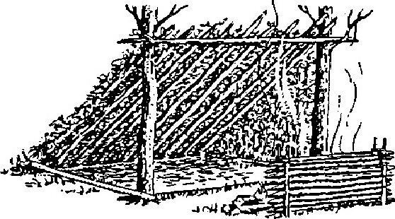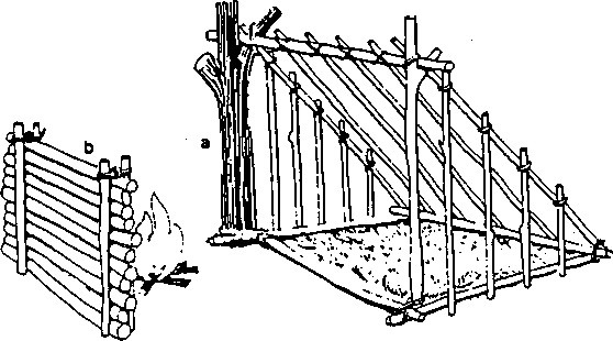 If there is nothing solid to lean a roof against and you are not trying to keep out heavy rain or a blizzard, use panels of wattle or frames covered in grass for protection. Erect a horizontal cross-piece between trees or on simple supports. On the windward side lean a panel of wattle, or tie or lean saplings at 45 degrees to make a roof. Add side walls as necessary (a). Site your fire on the leeward. Add side pieces and, this is the trick; build a reflector (b) on the other side of the fire to make sure that you get the full benefit of the warmth.
