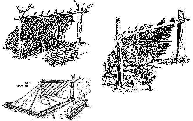 The lean-to is the standard timber shelter. When using a lean-to, however, it is important that you be tactically located where you can build a fire large enough to spread warmth equally throughout the shelter. The proper placing of the lean-to and fire in relation to prevailing winds is another consideration. This shelter can be improved by the use of a fire and reflector, which is built of green logs and placed on the opposite side of the fire from the opening of the lean-to. Large stones stacked behind the fire also reflect heat.