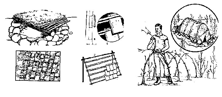 It is easy to build walls by piling sticks between uprights driven into the ground and (if possible) tied at the top. Caulk them well to keep out wind and rain. These are ideal for making one side of a shelter, for blocking a shelter's opening or for a heat reflector behind a fire. If large rocks are not available use this method to dam a stream. To make a very sturdy stick wall, increase the space between the uprights, use two stacks of sticks and, as you build it, fill the space between with earth.