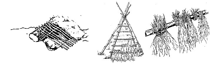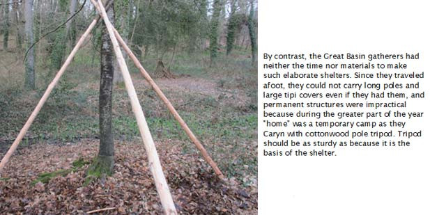 We next dragged in many more poles and leaned them against the original tripod. Wherever possible, we jammed and wedged them into position for greater solidarity. The large ends were butted into the ground, enclosing a circular inside-floor area about ten feet across. The inside height at the center was about five feet. Smaller sticks and branches were leaned or interwoven into the spaces between the larger poles. For the doorway at the front we left open a four-foot high, rectangular space between the larger poles. The covering or thatching should start at the bottom of the framework and progress upward so the layering effect will shed precipitation. If rain is imminent, one would be wise to construct a steeper walled wickiup than ours, but rain is generally nonexistent during the winter months in the Great Basin. Since temperatures were below zero much of the time, we were more concerned with protection from the wind. Although we achieved the desired end, we somewhat backwardly began thatching at the top of our frame and worked down; shoving successive bunches of mostly dead rabbit-bush and sagebrush under those above.