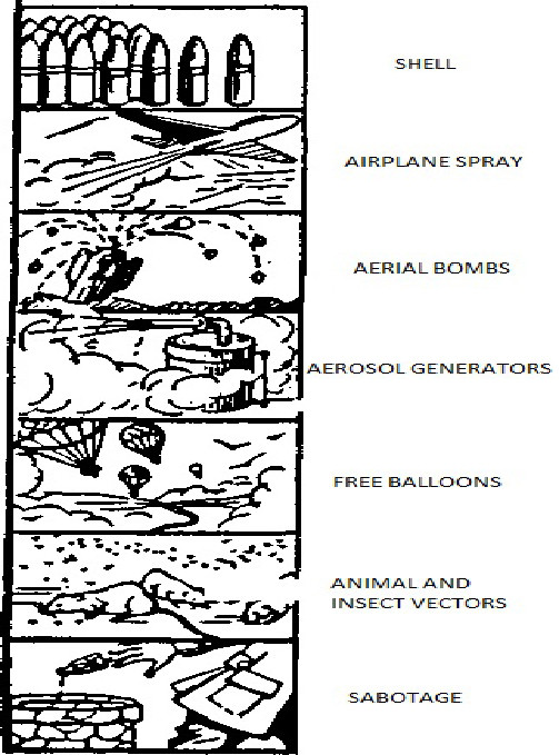 Finally, lets take a quick look at ways of dissemination of BW/CW weapons, clues for BW warfare at work (you can not use any of your senses of smell, sight, taste, hearing or touch) to detect the actual germs) and the best way to protect from the BW warfare. Figure 18 shows some of the dissemination schemes.