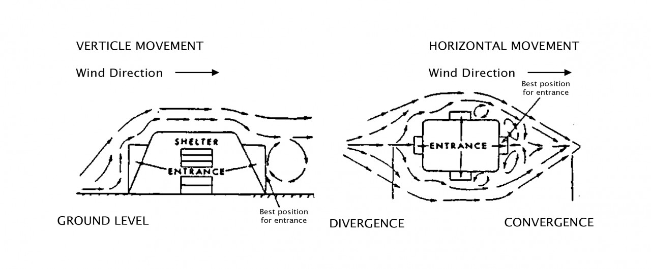Most of you are aware of the Nuclear Shelter problem. Two new requirements show up with the BW/CW shelter. First, you must always keep a slight positive pressure in the shelter so that NO chemicals or bio germs can enter. This means that some form of power will be needed at all times when an attack is under way. Secondly, you will need a "big gas mask" (BW/CW filter) to filter the entering air so no gases or germs can enter (more on filters a little later). If you have an underground (dirt covered) FALLOUT Shelter, you are partway there. If you have a Blast shelter, you are much closer to what you will need (the dirt cover and underground aspect helps to get rid of cracks through which agents and germs can enter). If you are having to "make do" with some other structure, you are not in as good a position. Such an "unventilated" shelter might get you by if the attack was light and you didn't see much and/or had some mask and suit protection. A large, sealed cavern (with existing air supply) might be useful, especially if you could seal the entrance. If the wind is high and you have some cracks, the gases can creep into almost any shelter. Figure 5 shows some wind design considerations when locating the shelter entrance. Be sure you know the prevailing wind conditions of your probable refuge so you can arrange the "best possible" situation for the most time