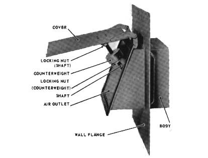 The purpose of this valve is to control the static pressure. It lets air out of the shelter (at a controlled rate) and is the means of scavenging the air out of the air locks and shelter auxiliary rooms. The duct is 8" on each side and is mounted 20° off of the vertical. The rod and counterweight can be adjusted to control the pressure. This valve should be mounted 30" from the floor.