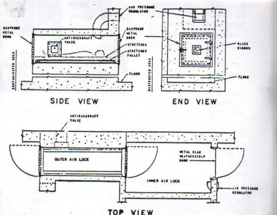 If the facility is to include stretcher cases (personnel retrieved from the scene) then it will be necessary to include an air lock with stretcher admission. Figure 9 shows how this is done.