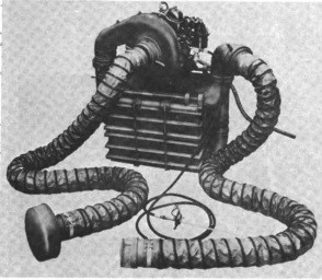 Next we come to the "big gas mask" or a s the military calls them " the collective protector" as opposed to the "individual protector"; gas mask. Figure 14 shows one of these units. It consists of a canister (a huge one), a powered blower motor, and an inlet and outlet hose. The one shown in the figure is 34" long, 24" wide and 39" high and weighs 675 lbs. It can pump 300 CFM of purified air. The air hoses are 5" in diameter with the inlet being 10 feet long and the outlet at 20 feet. The electric motor is 1 HP and the gasoline 1 ½ HP. The canister is classified, but is made up of 7 sections (attached in parallel) and includes three air manifolds, two particulate filters and two charcoal filters. Your odds of having a collect-protector are not very high, but we will look at how filters work and some substitute methods later.