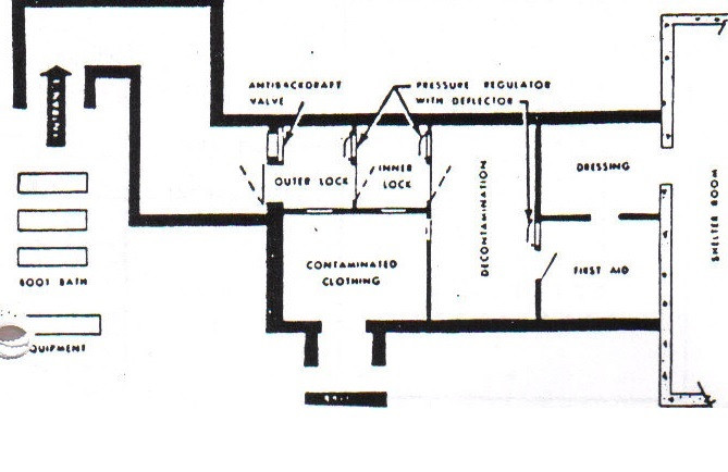 When personnel are brought into the shelter and they are contaminated, it will be necessary to decontaminate them. The facilities to do this are shown in Figure 10.