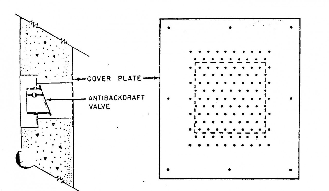 As noted in the text, if you expect conventional blast you need a blast plate to protect the valve. This plate is then mounted over the duct opening for the anti-backdraft valve. The area that is covered with holes should be about 1.2 times the area of the hole opening in the anti backdraft valve (a little extra). No dimensions were given for the hole size, but small was the word used!