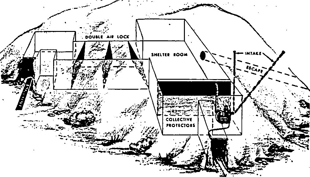 Figure 15 shows an "in-the side-of-a-hill" military shelter using some of the principles we have discussed. Notice the right angle entry, air lock and escape tunnel (which we did not mention earlier) and the location of the collective protector (with two intakes and an access area for maintenance, fueling, etc.).