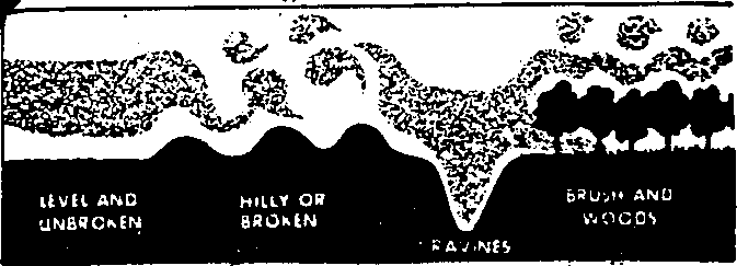 LEVEL AND UNBROKEN | HILLY OR BROKEN | RAVINES | BRUSH AND WOODS