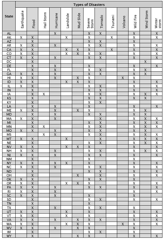 Check your Sate listing in the chart below to ascertain the Natural Disasters types to which you might be vulnerable.