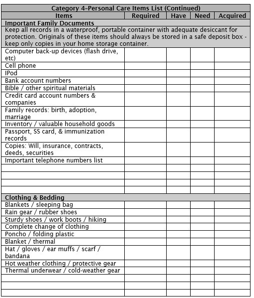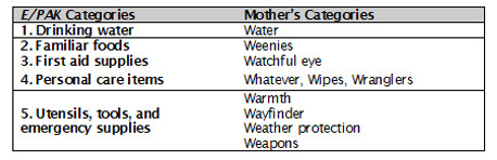 There are a lot of selections from which to choose. You, too, might elect to sort your "stuff" into three piles, as my Mother suggested to me! Details of the E/PAK categories are listed in the following chart. Items in boldface type are considered essential. There are many blanks for you to add the things that are important to you and your family.