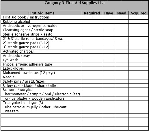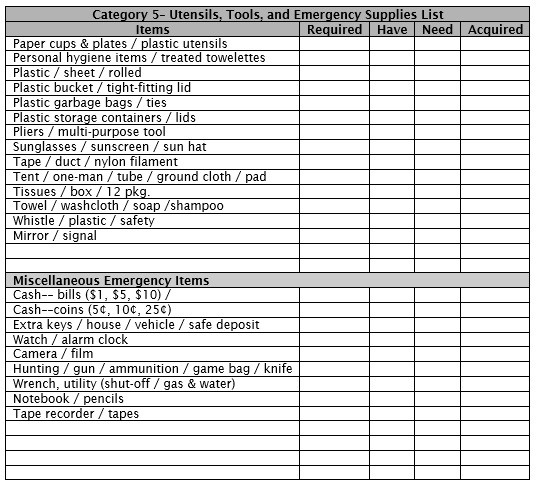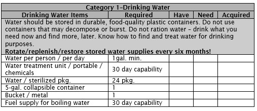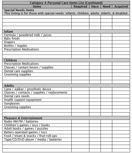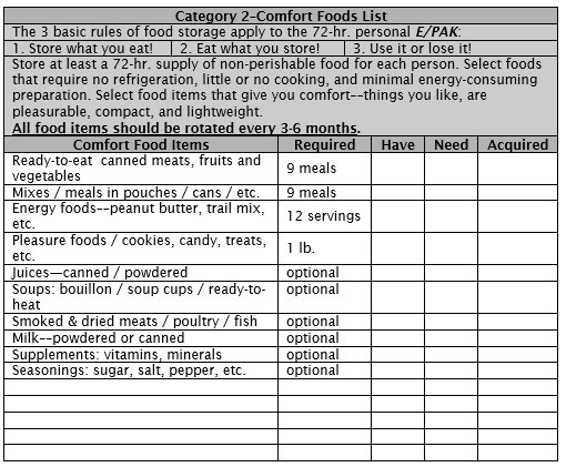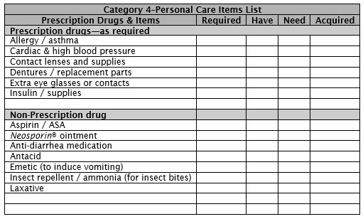 There are hundreds of versions of 72-hour kits. Indeed, they should all be customized to the user. The following chart will help you create your own customized and specialized 72-hour E/PAK.